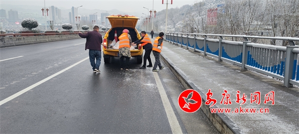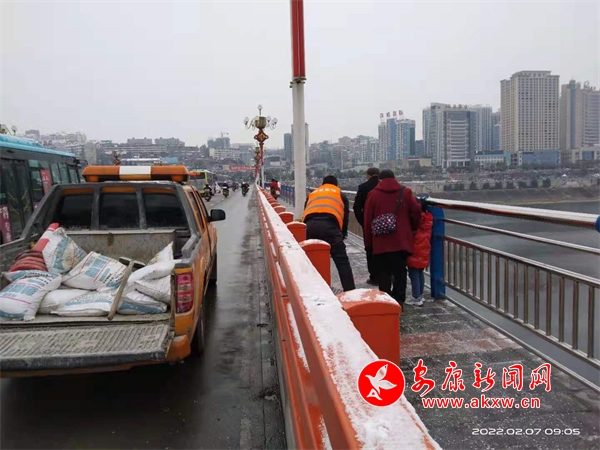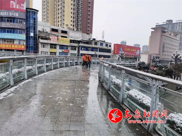 据了解,7日清晨,安康市市政园林处共投入人力40余人,融雪剂3吨,车辆10台,对城区雷神殿、马坎天桥、汉江一桥、三桥、南环干道陈家沟大桥及部分公园集中开展除雪融冰工作。QYg安康新闻网