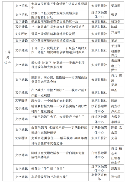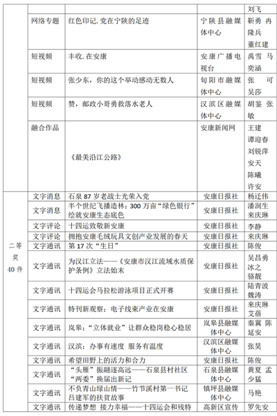 获得本次安康新闻奖作品共计114件,其中一等奖25件(报纸类10件,电视广播类10件,新媒体类5件)、二等奖40件(报纸类15件,电视广播类15件,新媒体类10件)、三等奖49件(报纸类20件,电视广播类16件,新媒体类13件)。张俊等16名同志获得安康市优秀新闻工作者称号。从评选的范围、内容、体裁、形式等方面看,都好于往年。