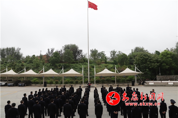 9时整,升国旗仪式正式开始。全体干警精神饱满,整齐列队,护旗手迈着矫健的步伐将鲜艳的五星红旗护送至升旗台。伴随着雄壮嘹亮的国歌声,五星红旗冉冉升起,全体干警庄严肃立,向国旗行注目礼。