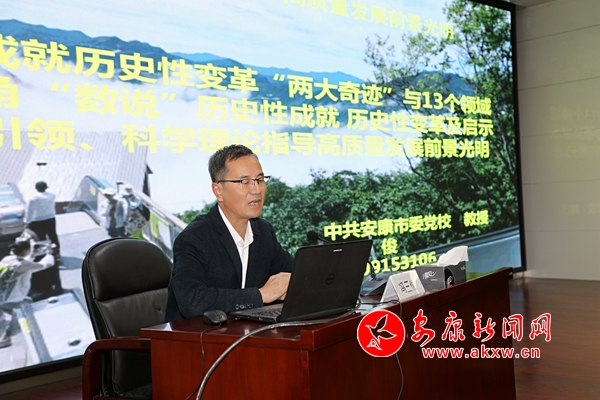 安康经济领域知名专家冯三俊作题为《“数说”历史性成就历史性变革,高质量发展前景更光明》的讲座,从历史性成就历史性变革“两大奇迹”与十三个领域、三个视角“数说”历史性成就历史性变革、新思想引领科学理论指导高质量发展前景光明三个层面为大家进行了精彩的宣讲。