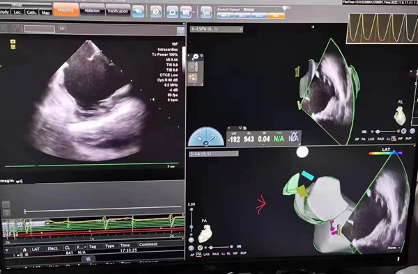 心律失常团队在11月6日为患者在ICE引导下行房扑射频消融术。穿刺左锁骨下静脉,导丝走行证实了合并永存左上腔静脉。穿刺右股静脉,分别送入心腔内超声导管和消融电极,超声下建立右心室、右心房、左心室、左心房、二尖瓣和三尖瓣及三尖瓣峡部模型。ICE就像术者多了一双天眼,可以对心脏内部结构一目了然,360度无死角观察心脏结构,可以做到“所视即所及”。建模后,消融三尖部峡部,房扑很快终止,转为窦性心律,手术获得成功。手术用时仅70分钟,术后病情稳定,安全返回病房。