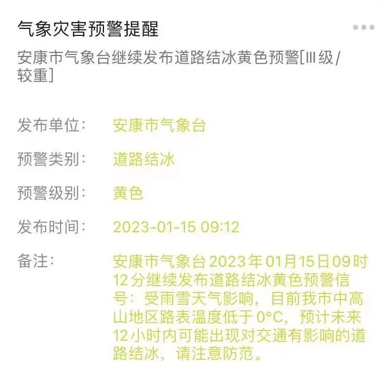 今天09时12分,安康市气象台继续发布道路结冰黄色预警信号:受雨雪天气影响,目前安康市中高山地区路表温度低于0℃,预计未来12小时内可能出现对交通有影响的道路结冰,请注意防范。