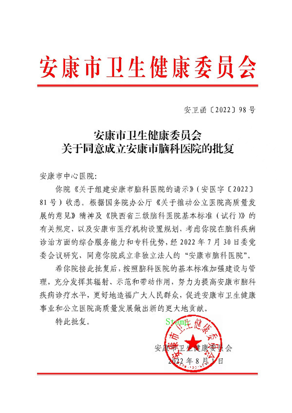 8月10日,市卫健委正式批准成立“安康市脑科医院”,开启了安康市脑病科领域发展新篇章。