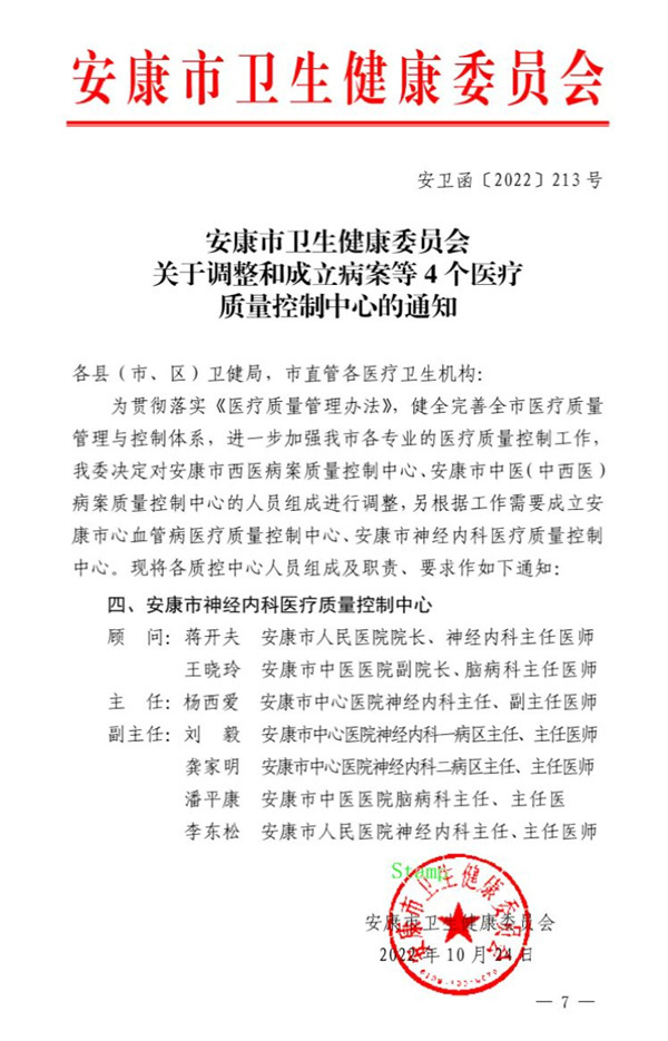 10月24日,市卫健委成立安康市神经内科医疗质量控制中心,挂靠脑科医院。杨西爱为中心主任。