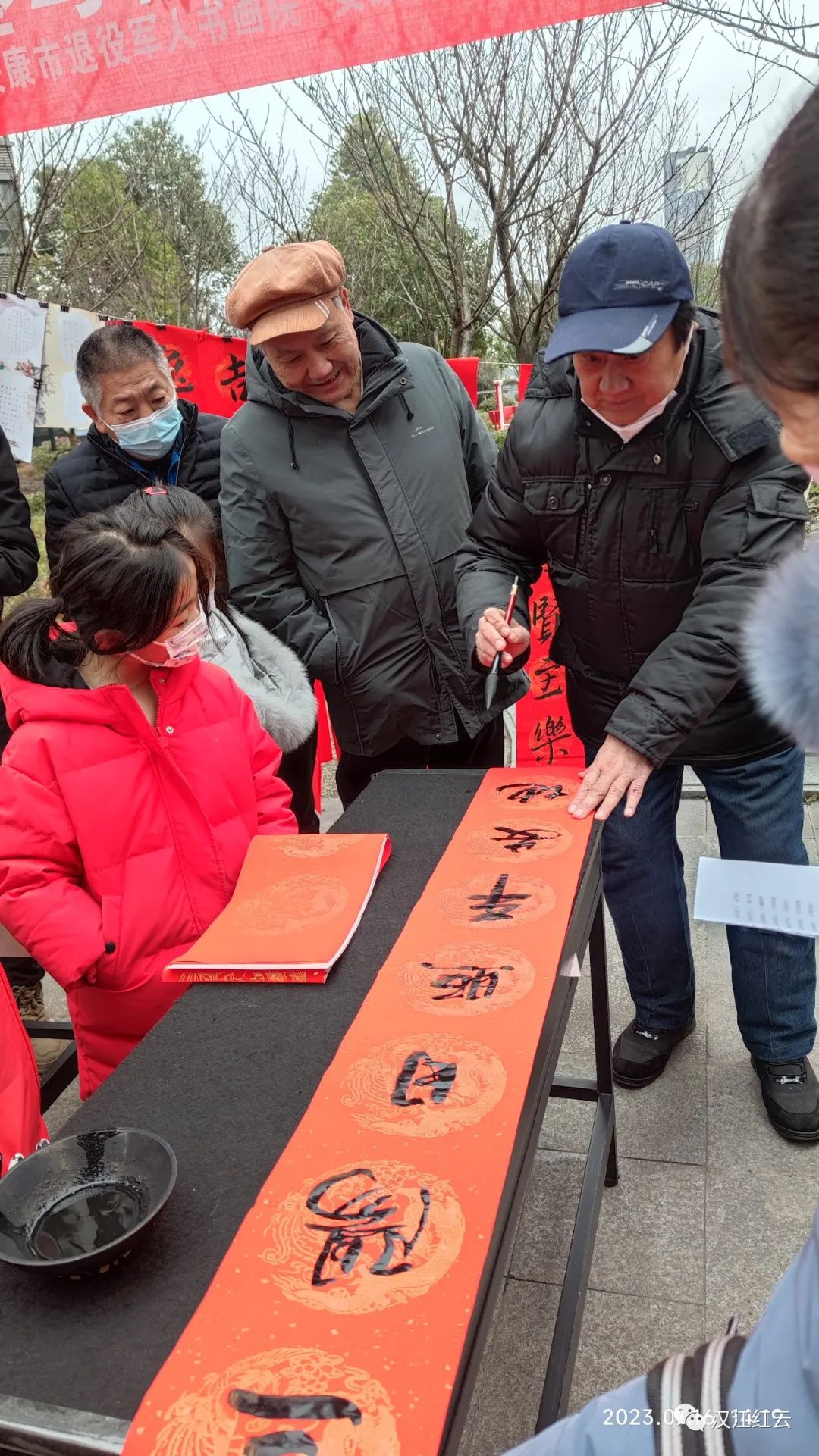 此次义写春联活动还走进了汉滨区早阳镇,“朱红春帖千门瑞,翠绿柳风万户新”"盛世红梅迎雪舞,新时玉兔踏春来”,一幅幅红彤彤的春联给早阳镇干部和群众带来迎春的喜悦。