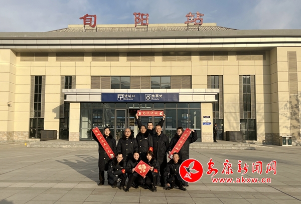 Wfj安康新闻网 图为该站职工在旬阳站站前广场向全国人民送上新春祝福Wfj安康新闻网