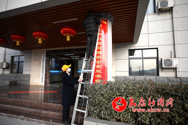 Wfj安康新闻网 图为该站干部职工在机关楼下贴春联Wfj安康新闻网
