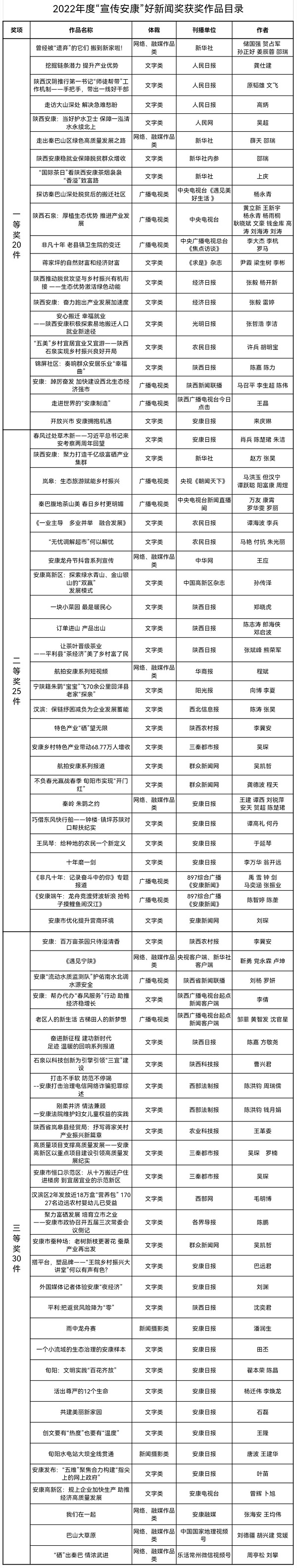 为充分发挥“宣传安康”优秀新闻作品示范作用,进一步激励广大新闻工作者奋发有为,争先创优。经过各申报单位推荐,市委宣传部初审、复审并组织专家定评,评选出拟获2022年度“宣传安康”好新闻奖件75件,其中一等奖20件、二等奖25件、三等奖30件。3zu安康新闻网