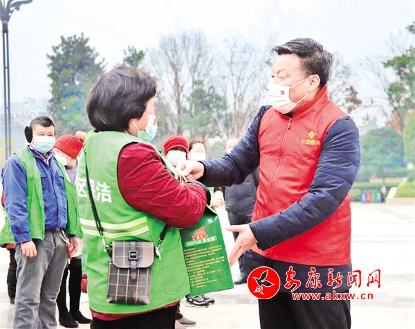 春节前,安康市慈善协会会长崔光华看望环卫工人,并为其发放慰问品。 张蕾 摄