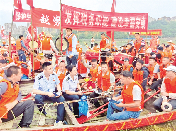 6月20日,汉滨区税务局纳税服务小分队走进龙舟节主会场,向龙舟队员和市民介绍税费征缴政策。陈荣斌 摄hRd安康新闻网