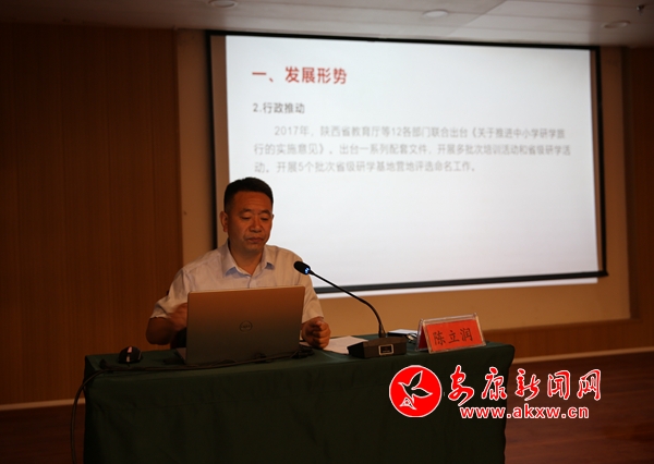 安康市教育学会会长、安康市大中小学研学旅行实践教育基地共同体理事长陈立润作《安康市大中小学研学实践教育活动的探索与思考》专题报告,报告围绕发展形势、亟待解决的问题、课程体系建设、共同体的工作方向四个方面深入浅出地剖析了安康研学旅行教育活动发展的现状及未来发展方向。