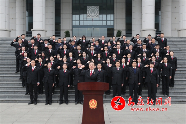 上午10时,在庄严的国歌声中,四名法警正步护送国旗入场。随后,院长刘娟走向领誓台,左手抚按宪法,右手举拳,领诵誓词。全体班子成员、法官干警共67人高举右拳,以铮铮誓言许下对宪法的忠诚和对人民的庄严承诺。