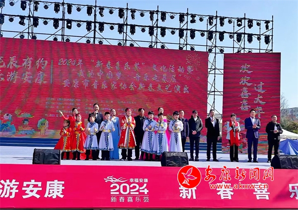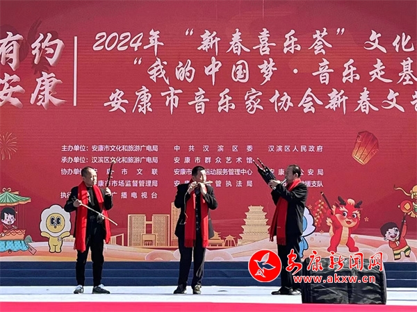 上午10时,张灯结彩的广场上,花团锦簇,人声鼎沸,歌声四起,热闹非凡。舞台大屏幕上“龙辰有约、乐游安康,欢欢喜喜过大年,我的中国梦——音乐走基层”字眼格外醒目。一首由安康十大民歌手周正凯演唱的《清江恋歌》拉开序幕,让市民们在悠久绵长动听的音乐声中去感受新春佳节色彩斑斓的文化韵味。安康市音乐家协会副主席李娜、央视《星光大道》优秀歌手李刚及音乐家协会张辉、卜照飞、李铭、张荣荣、周婷婷、秦维强相继登台献歌,《芦花》《父亲的草原母亲的河》《卓玛》等一首首脍炙人口的动听歌曲,赢得了现场近千名观众的阵阵掌声。特别是独具艺术魅力的小提琴独奏《我的祖国》、安康二胡艺术培训中心小朋友的《北京有个金太阳》、配乐朗诵《在春天的怀抱里》、民乐小合奏《扬鞭催马运粮忙》无不曼妙尔雅,把演出活动推向高潮。