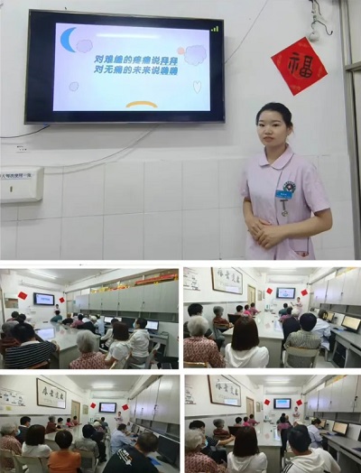 护士长马运侠以播放癌痛科普视频的方式,通过临床疼痛案例深入浅出地将癌痛防治知识分享给大家,现场与患者进行了“话疗”,消除他们的紧张情绪,帮助他们树立抗击癌痛的信心,科学的防癌抗癌,受到患者及家属的一致好评。