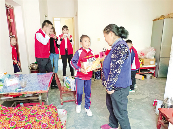 10月10日,石泉云雾山镇中心小学组织部分学生为社区老人整理房间、打扫卫生,还为老人送上节日的礼物。 谭相华 摄