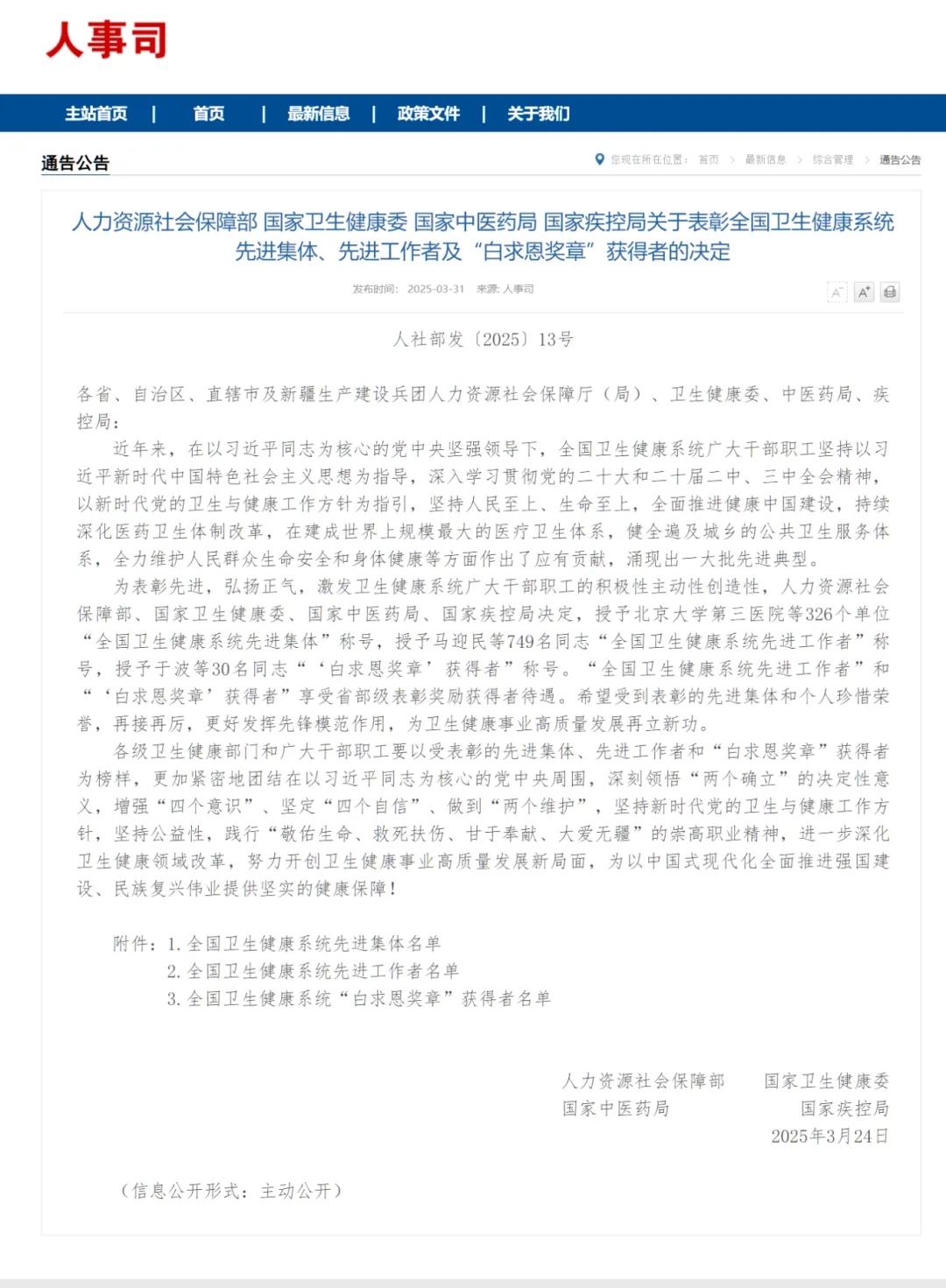 近日,人力资源社会保障部、 国家卫生健康委等四部委发布关于表彰全国卫生健康系统先进集体、先进工作者及“白求恩奖章”获得者的决定,我市1个集体、1人分别获得全国卫生健康系统先进集体、全国卫生健康系统先进工作者荣誉称号。