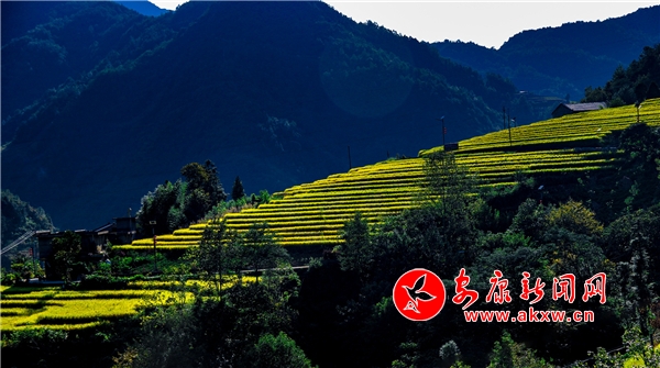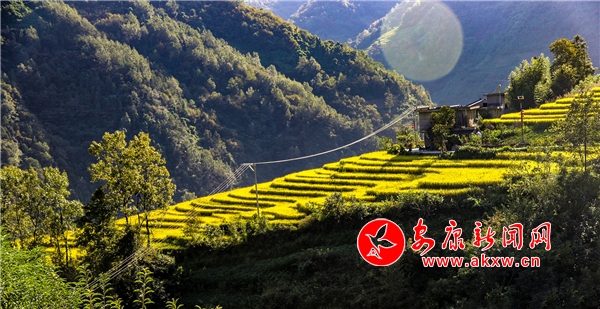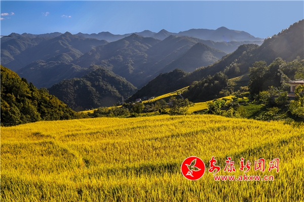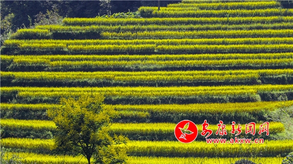 放眼望去,黄亮亮的稻谷,层层叠叠,从山底一直铺到半山腰。水田都是依山而修,随山形而变,高差均是随坡放缓,形状虽不十分规则却也精巧,动人之处全在自然的水平线上。