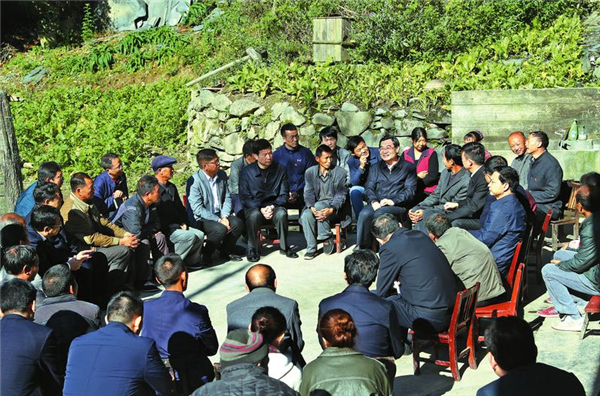 (10月10日,省委书记胡和平深入岚皋县南宫山镇西河村,与部分群众及镇村干部进行座谈,了解扶贫工作进展,听取群众意见建议,与大家一起商讨脱贫致富的措施。陕西日报记者 宋红梅/摄)