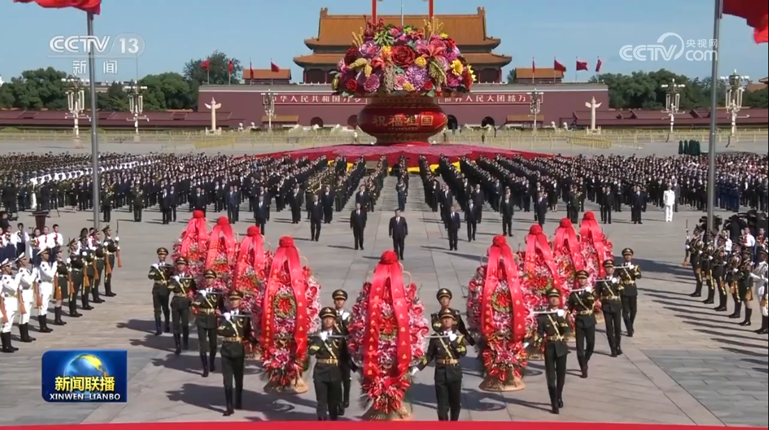 方阵前,以中共中央,全国人大常委会,国务院,全国政协,中央军委,各民主党派、全国工商联和无党派爱国人士,各人民团体和各界群众,老战士、老同志和烈士亲属,中国少年先锋队名义敬献的9个大型花篮一字排开,花篮红色缎带上书写的“人民英雄永垂不朽”格外醒目。Hwh安康新闻网
