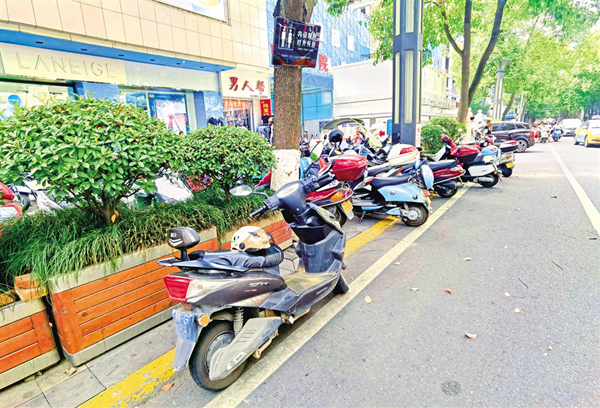 6月18日,在安康城区金州南路人行道上,部分车辆占用盲道、车身超出停车线(图1),未按要求停放车辆(图2),造成了安全隐患。(记者 张乔 摄)