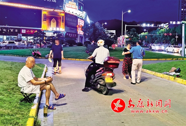 6月18日,有市民带着孩子在安康城区西津汉江大桥(三桥)南头街心绿地内玩耍,旁边就是“小草微微笑 请您旁边绕”的公益广告牌(图1)。不时还有摩托车、电动车从人行道经过(图2),存在安全隐患。(记者 潘润生 摄)qFt安康新闻网