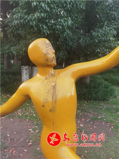 五一期间,安康高新区运动公园内,一处运动塑像遭人“抹黑”,污迹斑斑,有碍观瞻。(记者 许安)