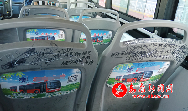 7月7日,笔者乘坐安康市城区7路公交车发现,公交座椅靠背惨遭“涂鸦”,内容不乏广告标语、低俗粗鄙、不堪入目的语言,严重影响乘车心情。希望广大乘客文明乘车,还市民一个干净整洁的乘车环境。(通讯员 成忠旭)siz安康新闻网