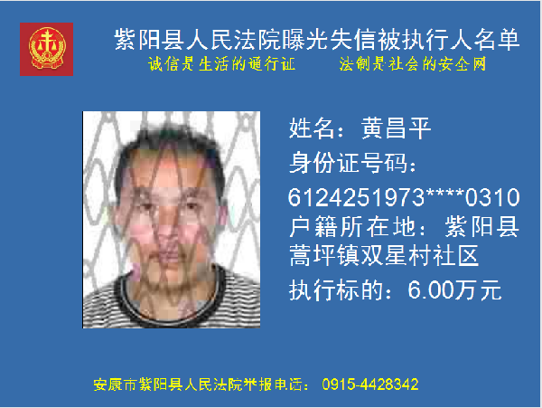 被执行人黄昌平,你因不履行(2017)陕0924民初241号民事判决书确定的义务,已被紫阳县人民法院纳入失信被执行人名单库依法进行信用惩戒。信用惩戒范围包括但不限于以下措施: