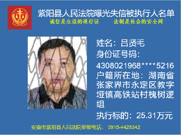 被执行人吕贤毛,你因不履行(2017)陕0924民初241号民事判决书确定的义务,已被紫阳县人民法院纳入失信被执行人名单库依法进行信用惩戒。信用惩戒范围包括但不限于以下措施: