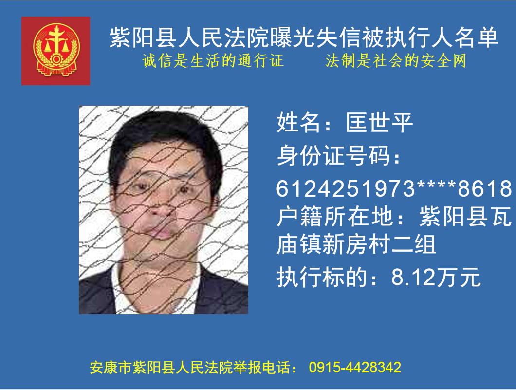 被执行人匡世平,你因不履行(2017)陕0924民初241号民事判决书确定的义务,已被紫阳县人民法院纳入失信被执行人名单库依法进行信用惩戒。信用惩戒范围包括但不限于以下措施:
