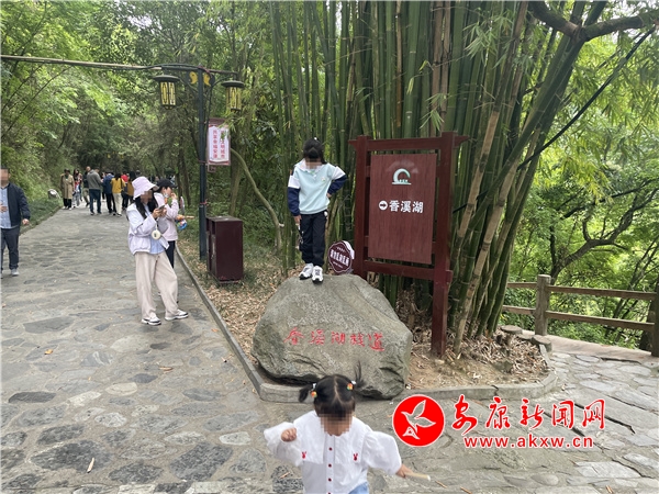 “楼阁云中建,竹木藏山巅。”“五一”期间,风景优美、距离城区较近的香溪洞风景区也迎来了“游客潮”。在众多自觉遵守文明出行规则的游客中,一孩童随意踩踏在景观石头上,和温馨提示牌上的“爱护环境,文明出行”形成鲜明对比。