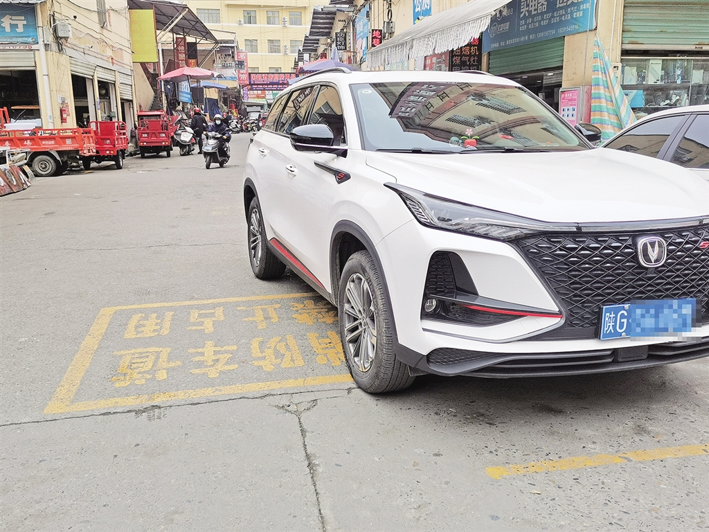 三桥批发市场内,一辆白色小轿车停放在消防车道标识之上