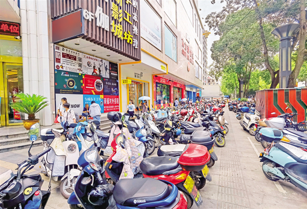 6月18日,在安康城区金州南路人行道上,部分车辆占用盲道、车身超出停车线(图1),未按要求停放车辆(图2),造成了安全隐患。(记者 张乔 摄)……