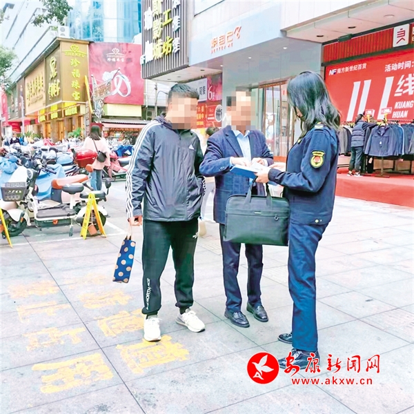 11月6日,汉滨区城管执法人员在金州路开展纠治随地吐痰专项执法,对随地吐痰人员提示改正,并根据相关规定进行处罚。市创文办供图……