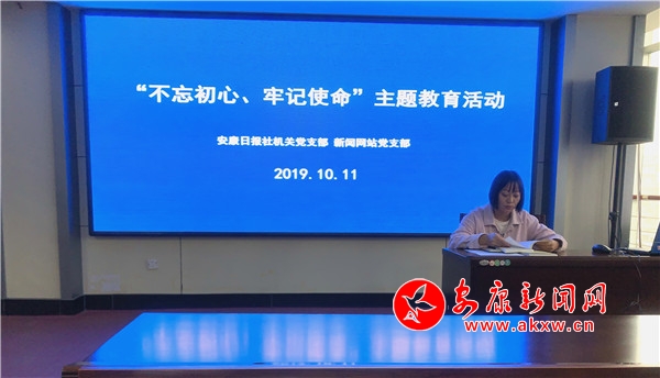本网讯 (记者 郭倩)初心即情怀,使命乃担当。初心表达价值追求,使命体现奋斗目标。10月11日上午,安康日报社机关支部与安康新闻网站支部联合开展“不忘初心、牢记使命”主题教育活动,以“找回初心”为号召,以强化宗旨意识和理想信念为目的,立足岗位,“教、学”相融合,同步提升新闻采编业务专业技能和综合业务能力,多样形式开展好主题教育活动。