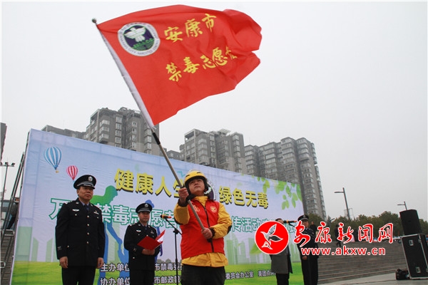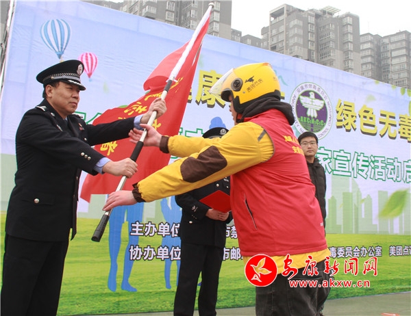 汉滨区禁毒志愿者,邮政管理局快递骑手,美团点评公司送餐骑手共同组成宣传志愿者方队。