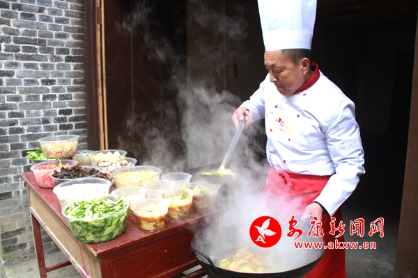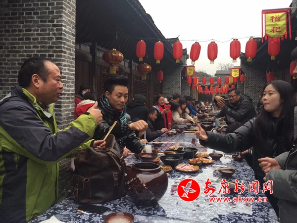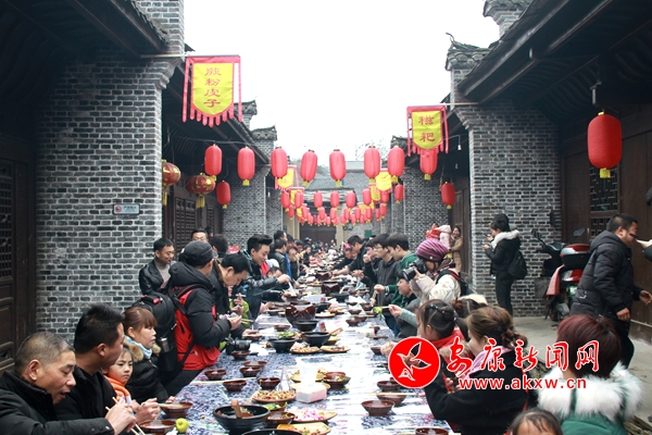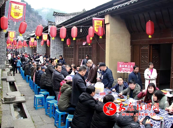 为让各地游客品尝到美味的汉阴名小吃,活动现场还举办了富硒美食品鉴活动。游客可通过竞猜答题、幸运抽奖等方式,参与品尝汉阴特色美食,零距离感受陕菜之乡的文化气息。在人气爆棚的古镇长桌庖汤宴上,百米长桌,游客相对而坐,特色泥碗盛满香甜美酒,当地游客以其独特的“陕南酒拳”与亲朋“切磋”助兴。本次庖汤宴包含6个地方凉菜、10个特色热菜和2个养生炖菜,“金猪送福”、“肝胆香爪”、“翡翠白菜”......一道道精心准备的菜肴让各地游客既感心意、又获暖意。现场参与庖汤宴的游客不仅能享用美食,还能获赠新春对联一副,收获满满的古镇祝福。