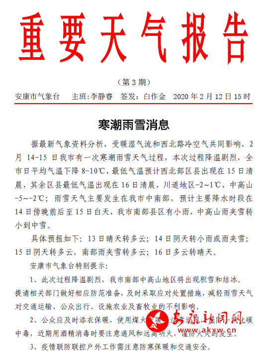 市气象台特别提示,此次过程降温剧烈,我市南部中高山地区将出现积雪和结冰提请相关部门做好相应防范准备;公众应及时添衣保暖,使用煤火取暖时注意通风,谨防一氧化碳中毒,近期用酒精消毒时要注意通风和远离明火,谨防火灾的发生;疫情联防联控户外工作需注意防寒保暖和交通安全。