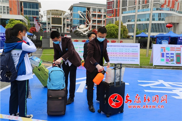 工作人员与老师在校门口有条不紊地开展着校园防疫工作,测体温、查看“健康码”、对行李及物品进行消毒等工作有序进行着。学校高三年级29个班、1300多名学生实行错峰报到,在今天早上9点至下午15点,分批次从学校正门的四个通道进入校园。