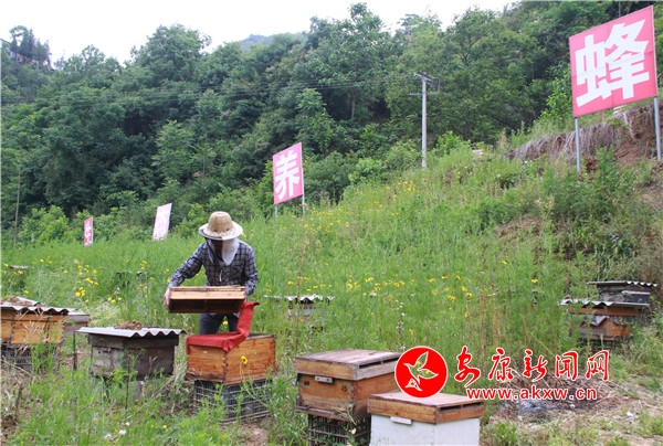 2017年,可以说是余升富养蜂生涯的转折点。汉滨区林业局、茨沟镇林业站干部带着茨沟镇营盘垭村村干部到岚皋县花里村余升富的养蜂基地考察养蜂项目,一次性购买了500箱蜜蜂,运回了茨沟。同时,还把老余带到了茨沟镇参观指导。