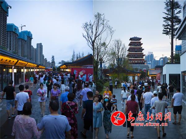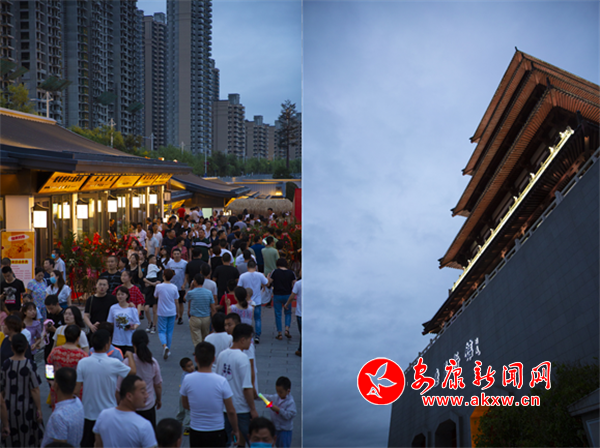 6月28日晚,夜色渐临,汉江边上,西城阁旁,古西城文化园(西城坊)游人如织。人们三五成群,或乘凉游玩,或聚餐畅谈,一派繁华热闹景象。(记者 张世虎 摄) Bw3安康新闻网