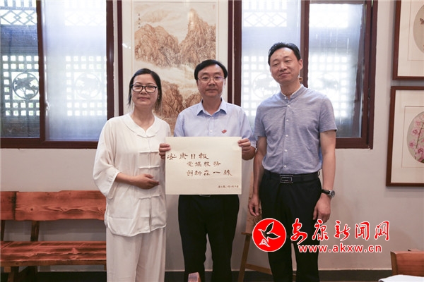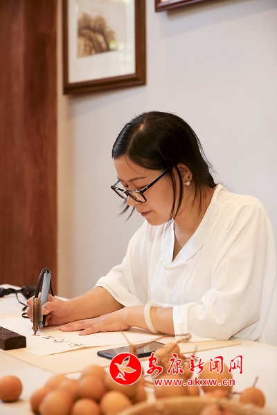 6月24日,李红霞为安康日报社烙画作字——“党媒服务创新在一线”。烙画又称火笔画,中国传统艺术珍品,用火烧热烙铁在物体上熨出烙痕作画。烙画创作在把握火候、力度的同时,注重“意在笔先、落笔成形”。