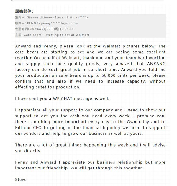近日,陕西安贝斯玩具科创有限公司董事长沈爱华收到一封来自海外的感谢信。来信者是安贝斯的美国客人,沃尔玛集团的副总裁Steven先生。