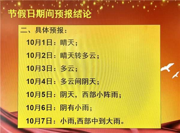 10月1日:晴天;10月2日:晴天转多云;10月3日:多云;10月4日:多云转阴天;10月5日:阴天,西部小阵雨;10月6日:小雨;10月7日:小雨,西部中到大雨。