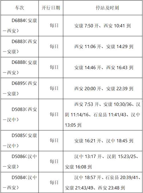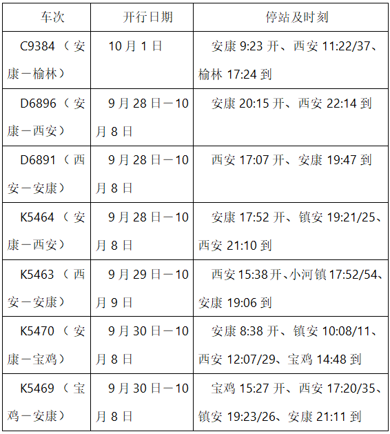据悉,10月1日,首次加开安康至榆林城际列车1列;9月28日至10月8日,安康—西安间,每日加开“复兴号”动集动车组1对,普速列车1对;9月30日至10月8日,安康—西安间,每日加开普速列车1对。