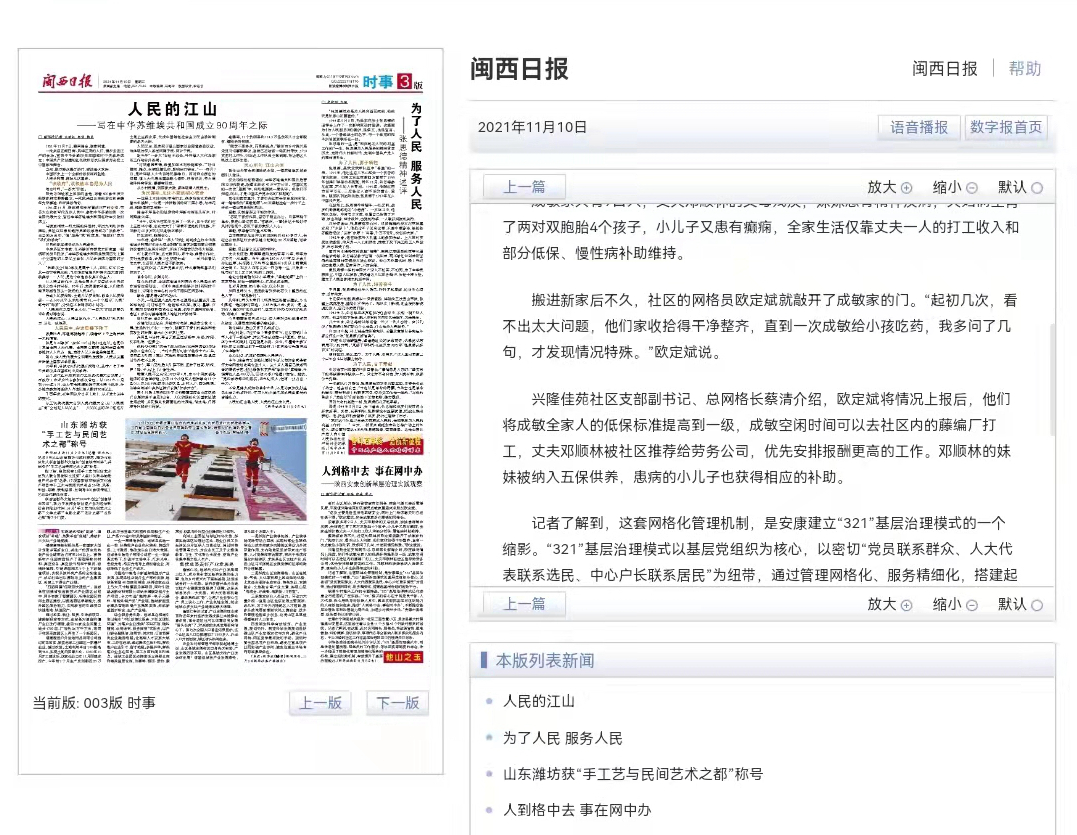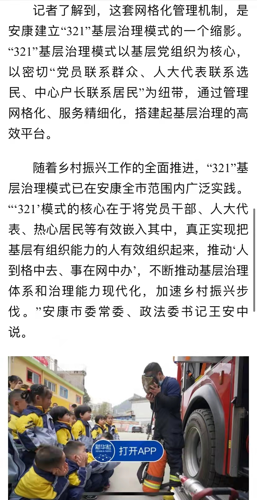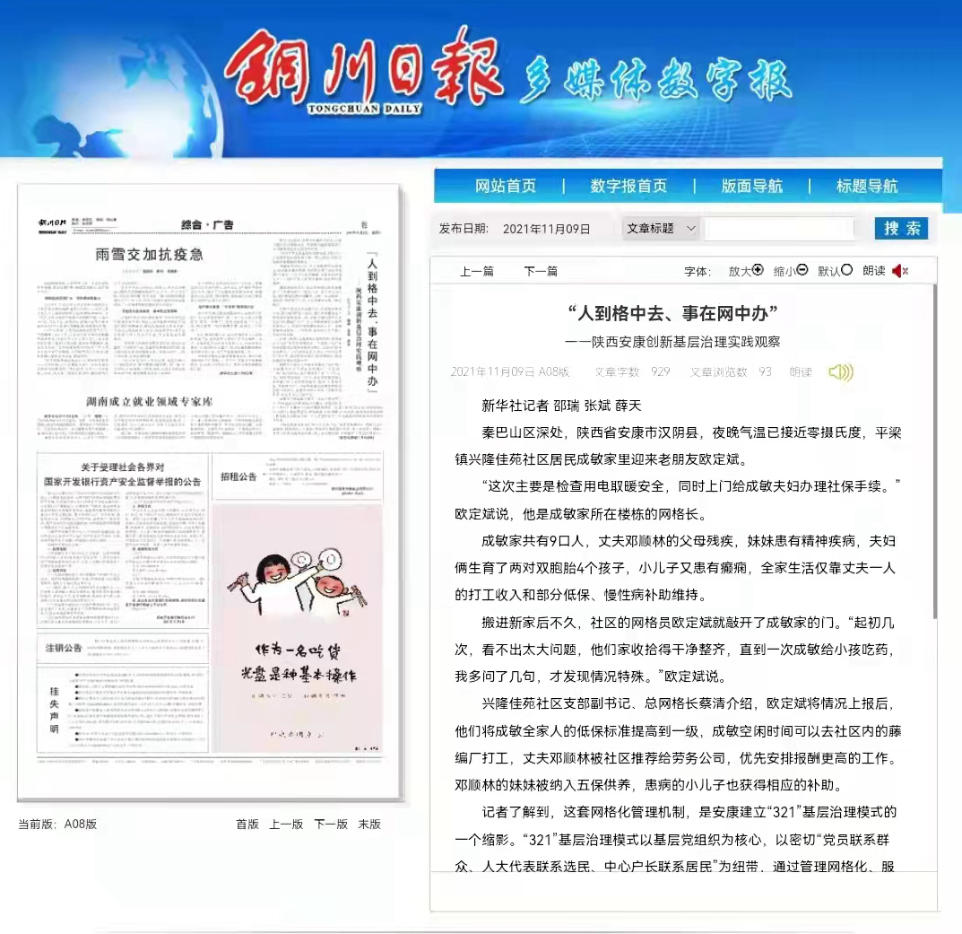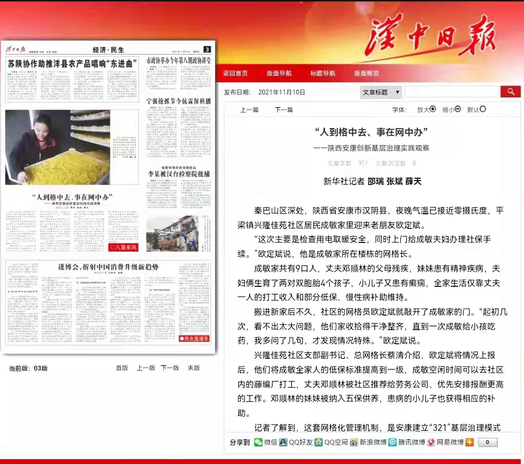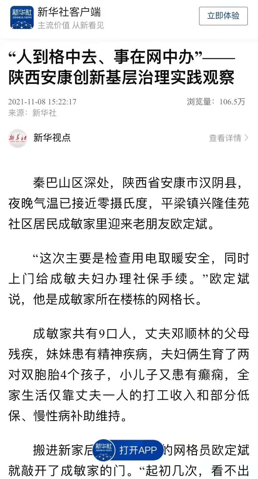 该模式是我市积极探索基层治理的生动实践,已在全市推广。稿件发出后,新华网、光明网、半月谈、中国小康网、21CN新闻、湖北日报等80余家中省市媒体纷纷转载,进一步提升了我市“321”基层治理模式在全国范围内的影响力。一起来看看新华社记者眼中的安康基层治理实践。zun安康新闻网