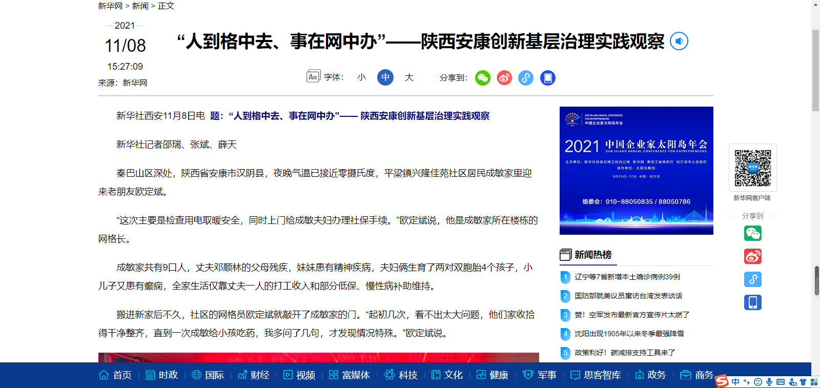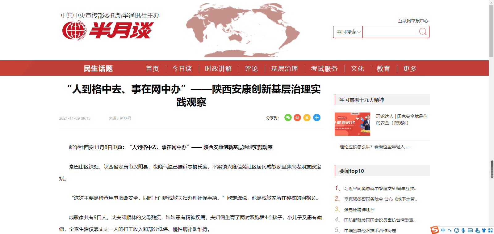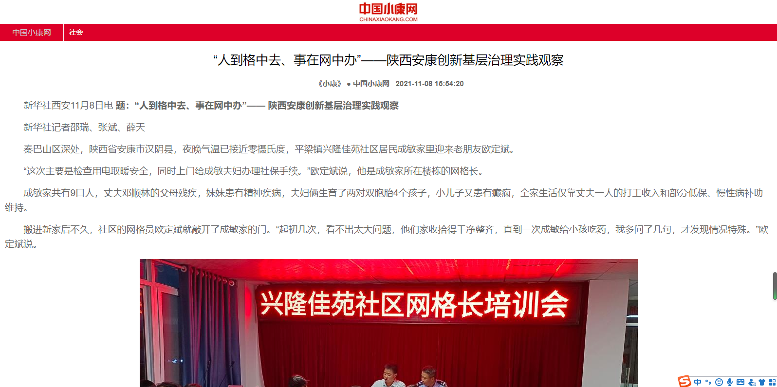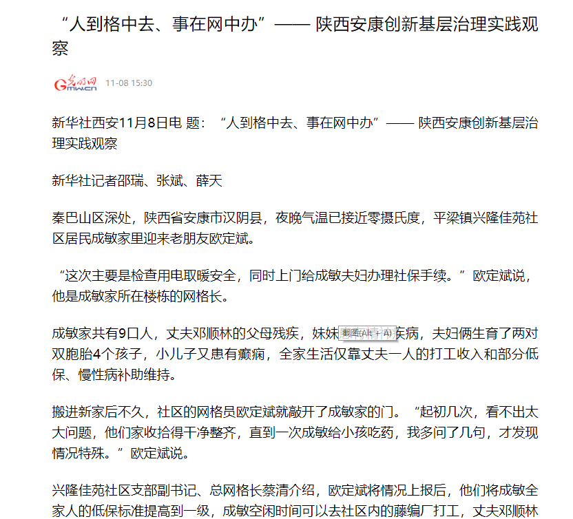 本网讯(实习记者 赵漪湉)11月8日,新华社刊发记者邵瑞、张斌、薛天采写的稿件《“人到格中去、事在网中办”——陕西安康创新基层治理实践观察》,聚焦我市创新建立的“321”基层治理模式。zun安康新闻网