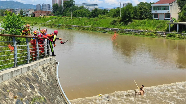水中水流又大又急,冲得王晓冬站不稳,没办法往岸边去。王晓冬知道可能没办法凭借自己的能力上岸了,当即决定向消防求救。“快打119!”王晓冬对岸边的妻子大声说道。王晓冬一边说一边将竹竿深深插入水中,他拉着孩子依靠着竹竿。