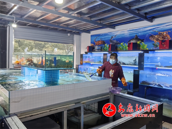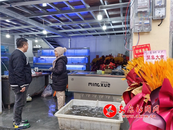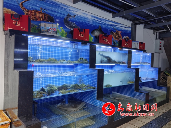 走进水产品区域,店铺里的蟹、虾、贝等海鲜货品齐全,价格一一写在鱼缸上。购买虾、蟹的顾客陈女士说,“我之前在兴安菜市场的时候就喜欢在他家买,但原来那边环境不太好,经常人都下不去脚,现在店铺周围都很干净。”