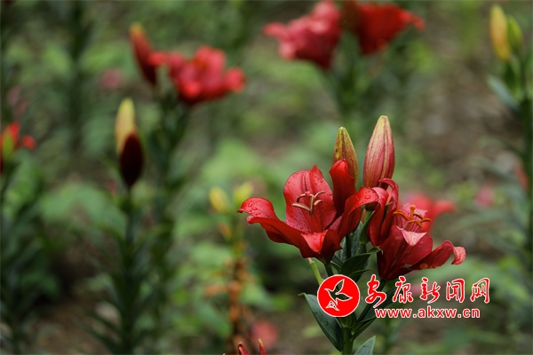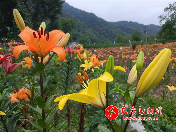 绚烂的百合花在夏日的暖阳下恣意绽放,与周围的碧峦、苍翠的树木、潺潺溪流,以及沉浸在喜悦中的人群,共同绘制了一幅生机勃勃、夏意正浓的生态风景画,展现出一幅自然与人文和谐共生的美好图景。